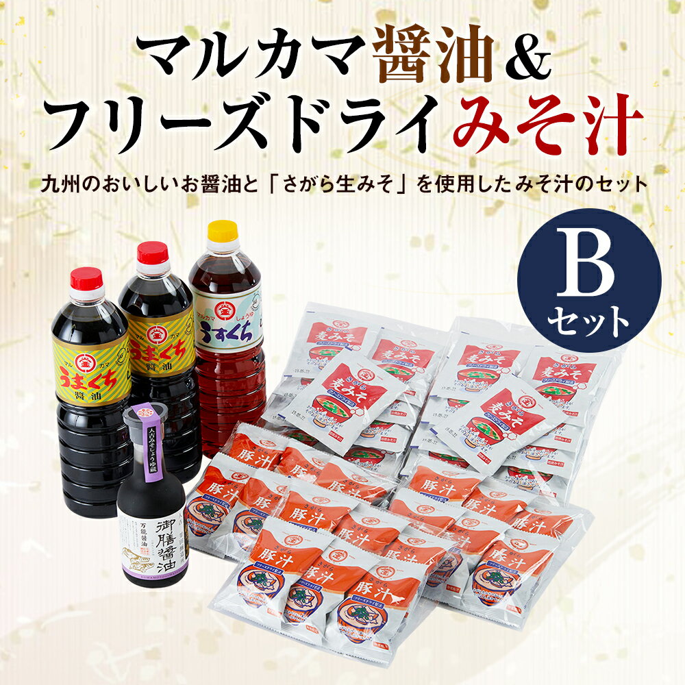 商品説明 名称 マルカマ醤油&フリーズドライみそ汁 Bセット 産地 熊本県 人吉市産 内容量 うまくち醤油1.0L 2本 うすくち醤油1.0L 1本 御膳醤油300ml 1本 さがらフリーズドライみそ汁 22食 さがらフリーズドライ豚汁 18食 原材料名 うまくち醤油:アミノ酸液、食塩、脱脂加工大豆、小麦、カラメル色素、調味料(アミノ酸等)、甘味料(サッカリンNa、甘草、ステビア)、保存料(パラオキシ安息香酸) うすくち醤油:アミノ酸液、脱脂加工大豆、小麦、食塩、調味料(アミノ酸)、甘味料(甘草・サッカリンNa)、保存料(パラオキシ安息香酸) 御膳醤油:しょうゆ、砂糖、発酵調味料、風味原料(かつおエキス、こんぶエキス)、調味料(アミノ酸等)、食塩、カラメル、甘味料(ステビア、甘草)、VB1 さがらフリーズドライみそ汁:調味みそ、かつお昆布だし、乾燥油揚げ、乾燥ねぎ、乾燥わかめ、植物油脂/甘味料、調味料、増粘多糖類、メタリン酸Na、漂白剤、酸味料、酸化防止剤 さがらフリーズドライ豚汁:調味みそ、豚肉、ごぼう、人参、油揚げ、かつお昆布だし、ポークエキス、醸造調味料、ごぼう風味パウダー、食物油脂、動物油脂、乾燥ねぎ/調味料、甘味料、増粘多糖類、酸化防止剤、メタリン酸Na、酸味料、VB2 賞味期限 別途商品ラベルに記載 保存方法 直射日光を避け、常温で保存 提供者 合資会社釜田醸造所 商品説明 人気の「うまくち醤油」と「うすくち醤油」にカツオと昆布のダシをぜいたくに使用したかけしょうゆ「御膳醤油」を加え、フリーズドライみそ汁をセットにしました。